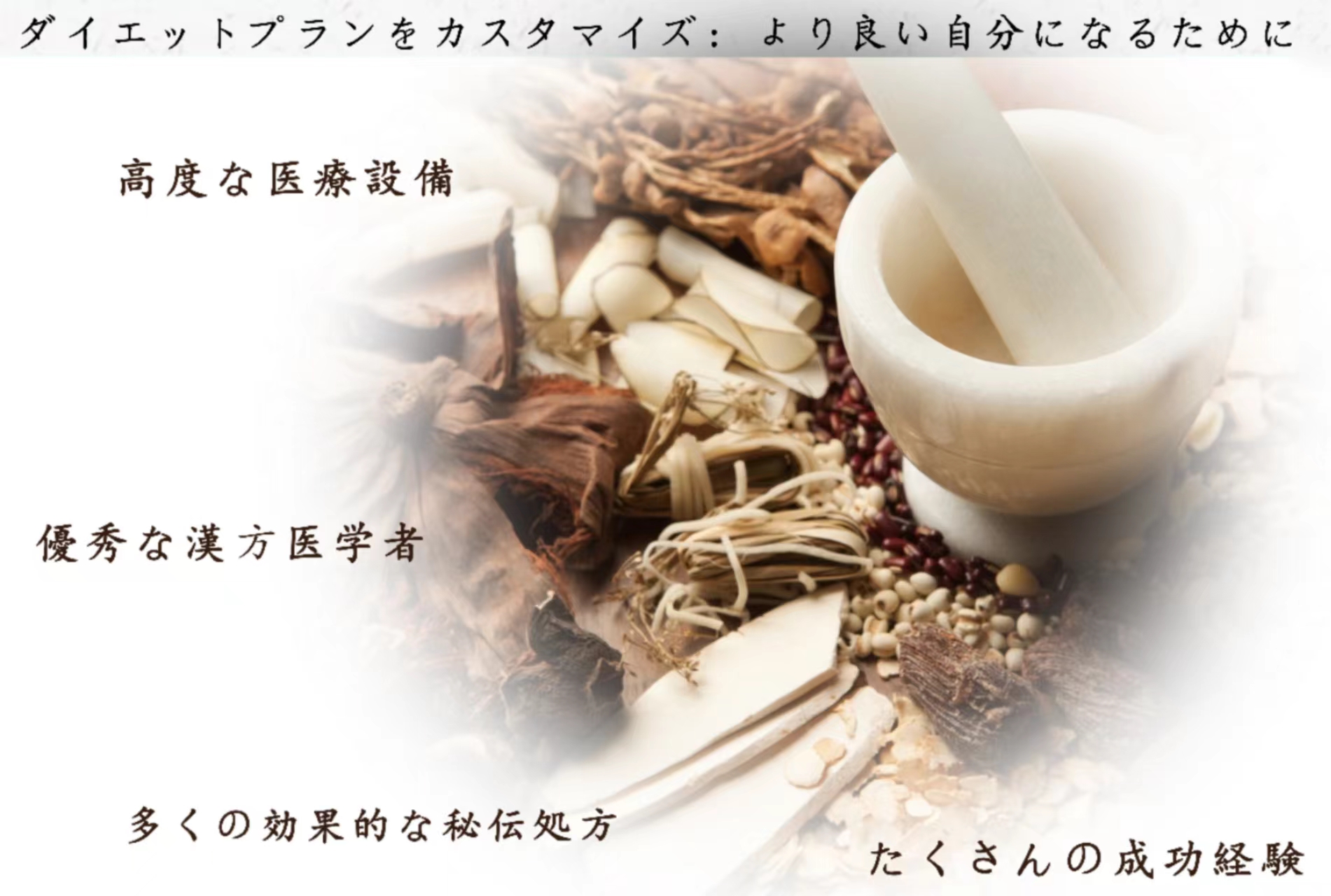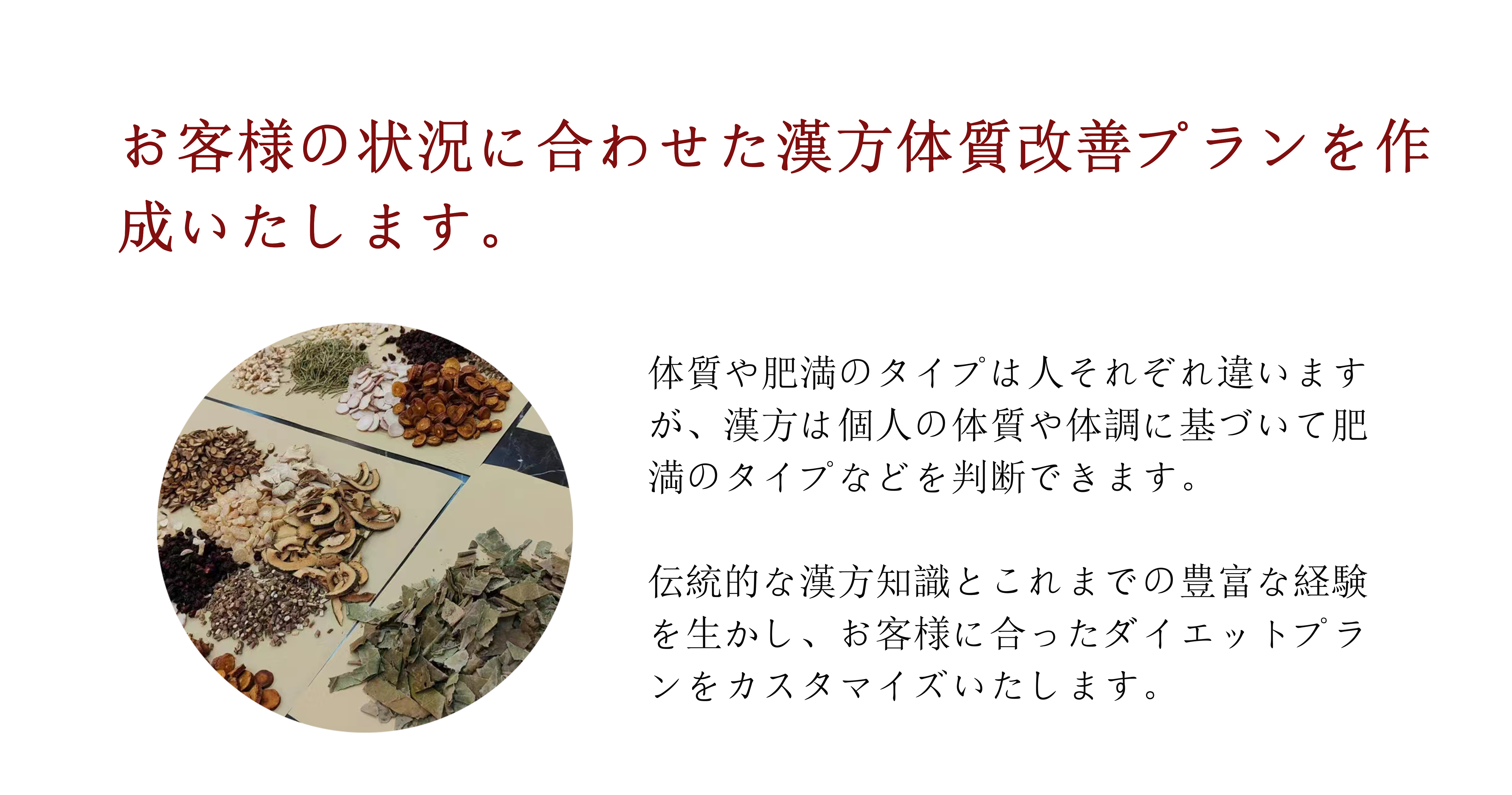 伝統的な漢方知識とこれまでの豊富な経験を生かし、お客様に合ったダイエットプランをカスタマイズいたします。